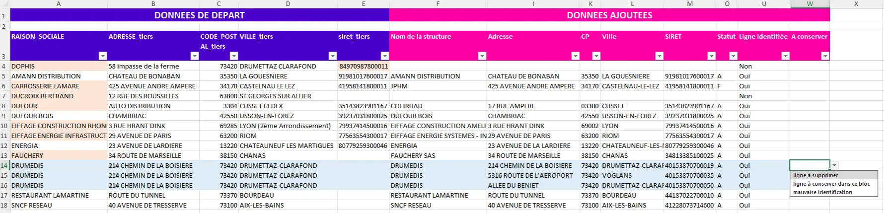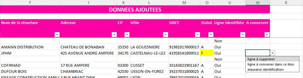 Une mise en couleur permet d’identifier rapidement les écarts entre vos données initiales et les données issues de la base SIRENE. Vous pouvez ainsi repérer immédiatement les lignes à corriger.