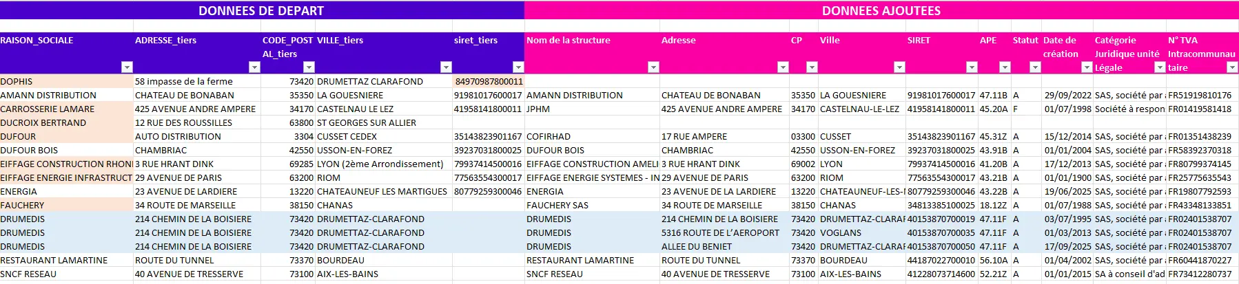 - Le fichier interroge automatiquement la base SIRENE et enrichit votre tableau